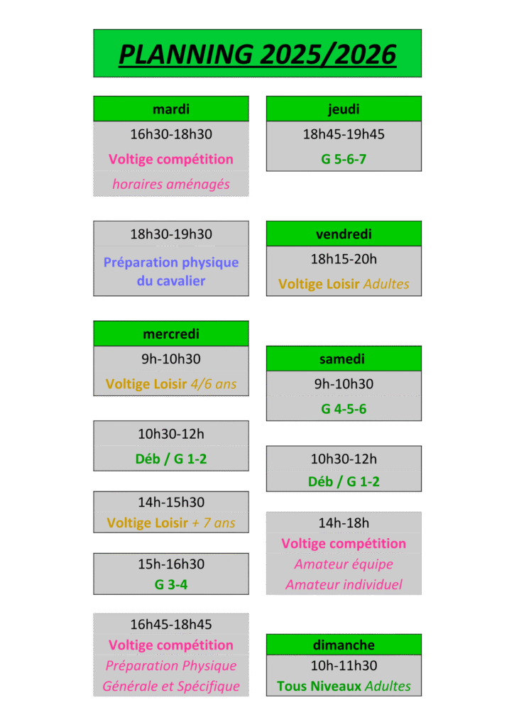 Vous voulez pratiquer l’équitation, le TREC ou la voltige régulièrement ? Retrouvez ici le planning annuel avec les horaires des cours collectifs.