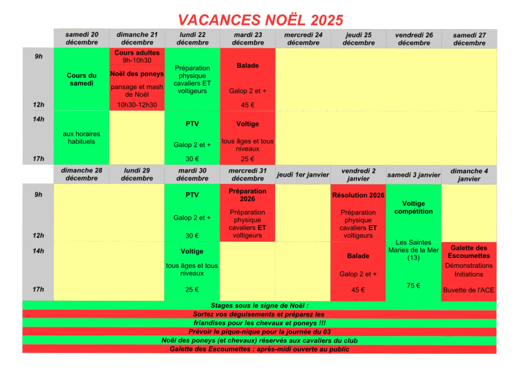 Vous voulez pratiquer l’équitation, le TREC ou la voltige régulièrement ? Retrouvez ici le planning annuel avec les horaires des cours collectifs.